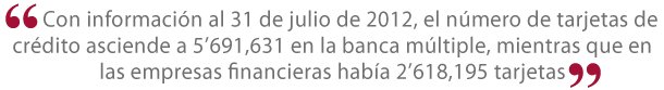 Ambos son esfuerzos de regulados y reguladores para que el público cuente con la suficiente información que le permita comparar y decidirse por un producto financiero, en este caso, un crédito. Con información al 31 de julio de 2012, el número de tarjetas de crédito asciende a 5'691,631 en la banca múltiple, mientras que en las empresas financieras había 2'618,195 tarjetas.