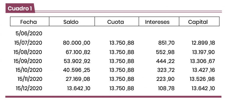 Cuando una empresa asume una deuda con el sistema financiero acepta una serie de condiciones, que incluyen intereses pactados y determinados cronogramas de pago. Por ejemplo, la empresa ABC recibe un préstamo por S/80 000 el 5 de junio del 2020, pagadero en seis cuotas iguales y siendo la primera cuota a pagar el 15 de julio.