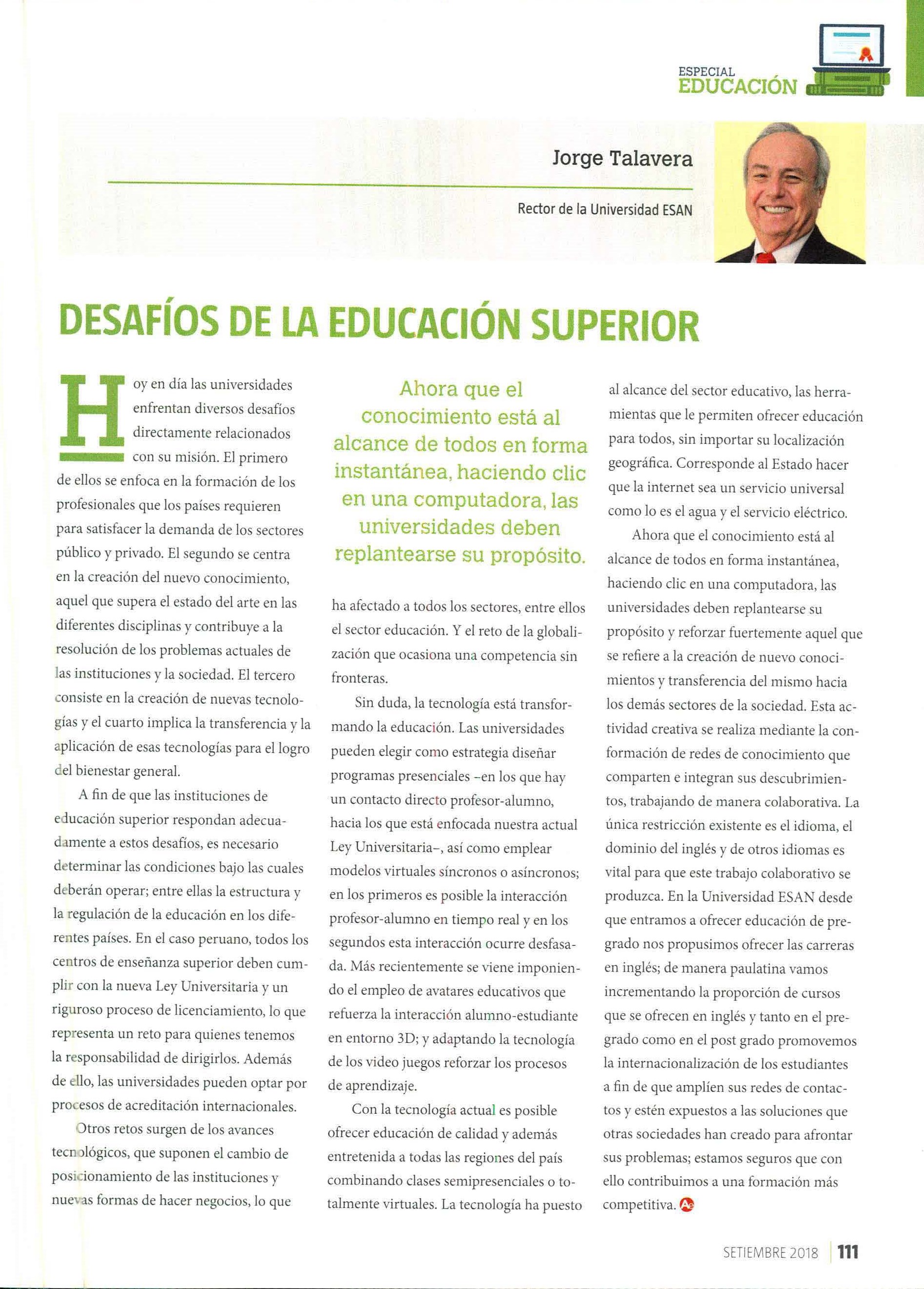 A fin de que las instituciones de educación superior respondan adecuadamente a estos desafíos, es necesario determinar las condiciones bajo las cuales deberán operar; entre ellas la estructura y la regulación de la educación en los diferentes países. En el caso peruano, todos los centros de enseñanza superior deben cumplir con la nueva Ley Universitaria y un riguroso proceso de licenciamiento, lo que representa un reto para quienes tenemos la responsabilidad de dirigirlos. Además de ello, las universidades pueden optar por procesos de acreditación internacionales.