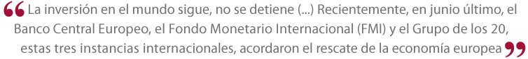 No hay estancamiento, ni retroceso. La inversión en el mundo sigue, no se detiene. De hecho hubo un pequeño paréntesis. Recientemente, en junio último, el Banco Central Europeo, el Fondo Monetario Internacional (FMI) y el Grupo de los 20, estas tres instancias internacionales, acordaron el rescate de la economía europea.