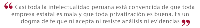 Por eso es triste ver cómo gente cultivada e inteligente acepta mentiras y se niega a aceptar la realidad cuando ésta no coincide con sus paradigmas de moda: casi toda la intelectualidad peruana está convencida de que toda empresa estatal es mala y que toda privatización es buena. Es un dogma de fe que ni acepta ni resiste análisis ni evidencias.