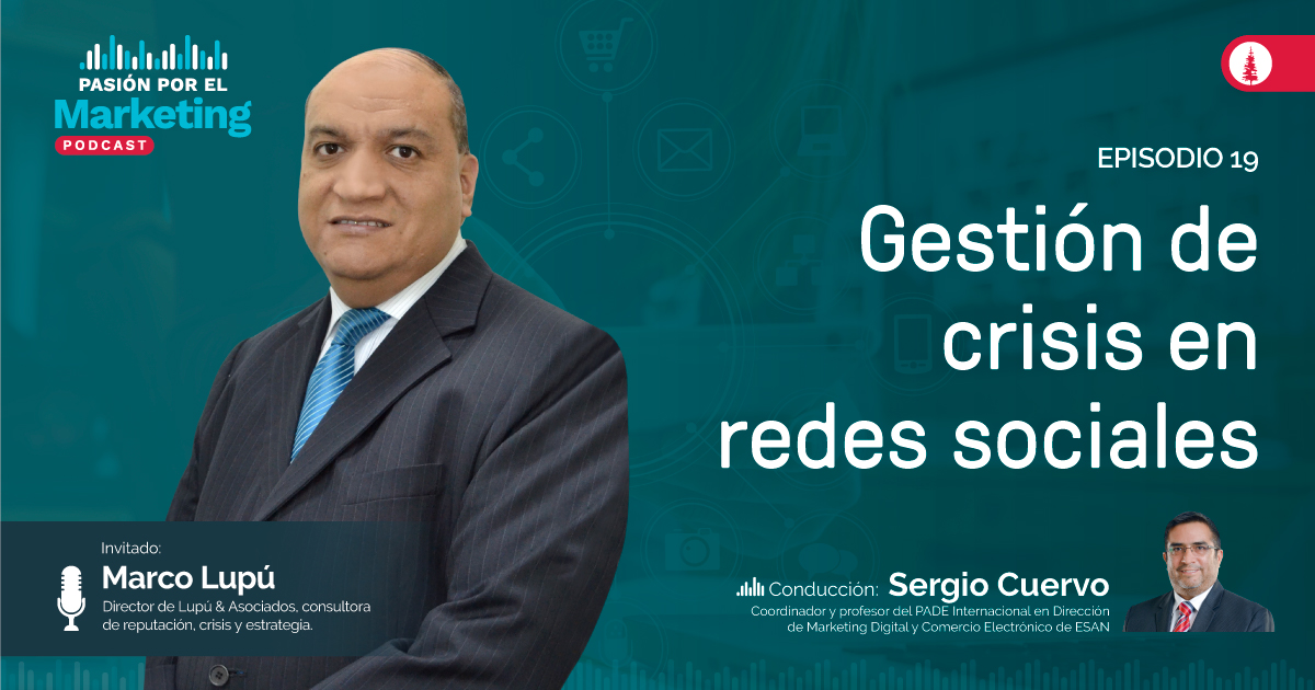En el episodio 19 del podcast #PasiónporelMarketing conoce cómo identificar y gestionar una crisis en redes sociales. Sergio Cuervo, coordinador y profesor del PADE Internacional en Dirección de Marketing Digital y Comercio Electrónico de ESAN conversó con Marco Lupú, director de Lupú & Asociados, consultora de reputación, crisis y estrategia sobre el tema.