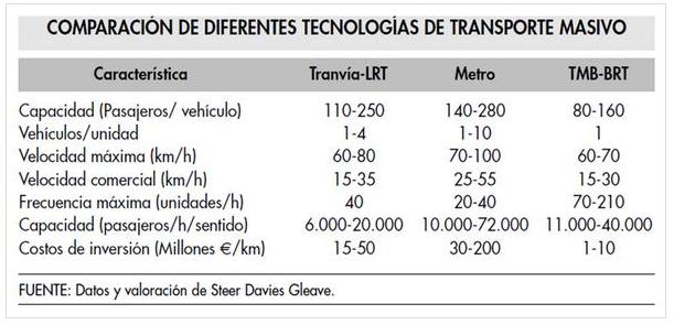 Tabla 1: Comparativa de características técnicas de diversos sistemas de transporte urbano